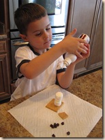 2. Using icing glue the snowman to a graham cracker half. (optional: put a square of Hershey’s chocolate bar between the snowman and graham cracker)
